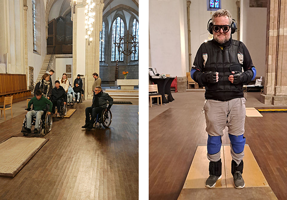 Der Parcours bot zahlreiche Herausforderungen: Kopfsteinpflaster, Schrägen, Sand und andere Hindernisse mussten mit einem Rollstuhl, Langstock oder einem Alterssimulationsanzug bewältigt werden. Die Teilnehmer*innen erfuhren, wie viel Kraft nötig ist, um mit einem Rollstuhl durch Kies zu fahren, oder wie viel Mut es braucht, einen kleinen Absatz nur auf den Hinterrädern zu überwinden.