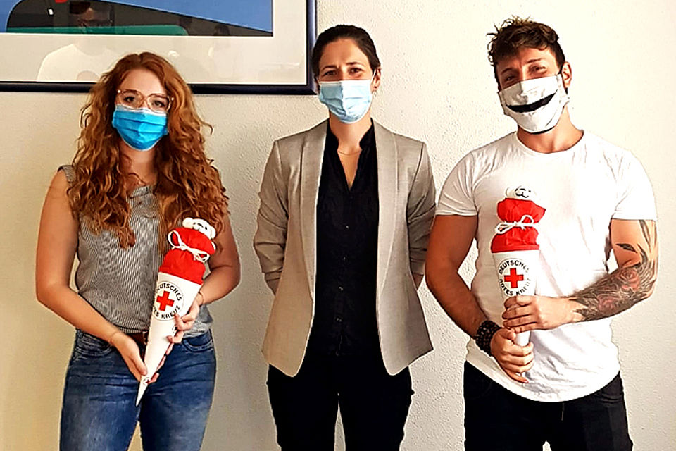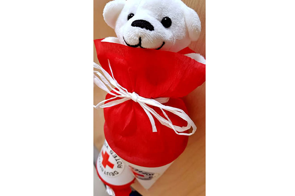 Außerdem wurden zwei neue Auszubildende zum Notfallsanitäter von der Rettungsdienstleiterin in Empfang genommen. Es handelt sich dabei um Marina Gülicher und Jaroslav Schäfer. Das Rote Kreuz sagt: herzlich willkommen! Zur Begrüßung gab es als Überraschung eine kleine Schultüte mit einem Rotkreuz-Bären.