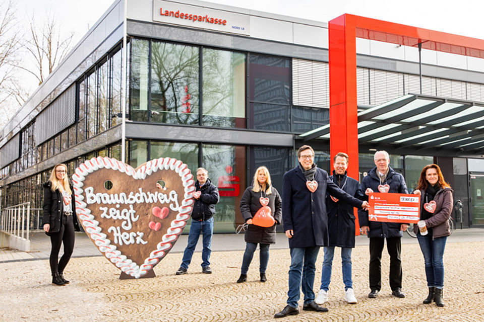 So kam ein Gesamtbetrag von 18.008,87 Euro zusammen, den Stadtmarketing, AAI, BLSK und REWE den Wohlfahrtsverbänden jetzt vor dem Hauptsitz der Braunschweigischen Landessparkasse übergeben haben.