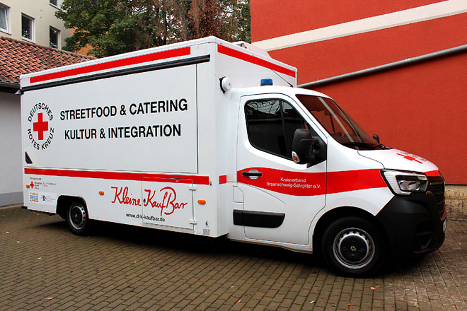 Der Rotkreuz-Kreisverband Braunschweig-Salzgitter geht mit einem neuen Verpflegungs- und Integrationsangebot an den Start, dem Imbisswagen „Kleine KaufBar“ – in Anlehnung an das Braunschweiger soziokulturelle Zentrum DRK-KaufBar mit seinem integrativen Restaurant-, Café- und Kultur-Angebot. Die „Kleine KaufBar“ bietet vegane und vegetarische Speisen an flexiblen Standorten an, bis hin zur Begleitung von Blutspende-Aktionen sowie bei Schadenlagen und Notfällen.