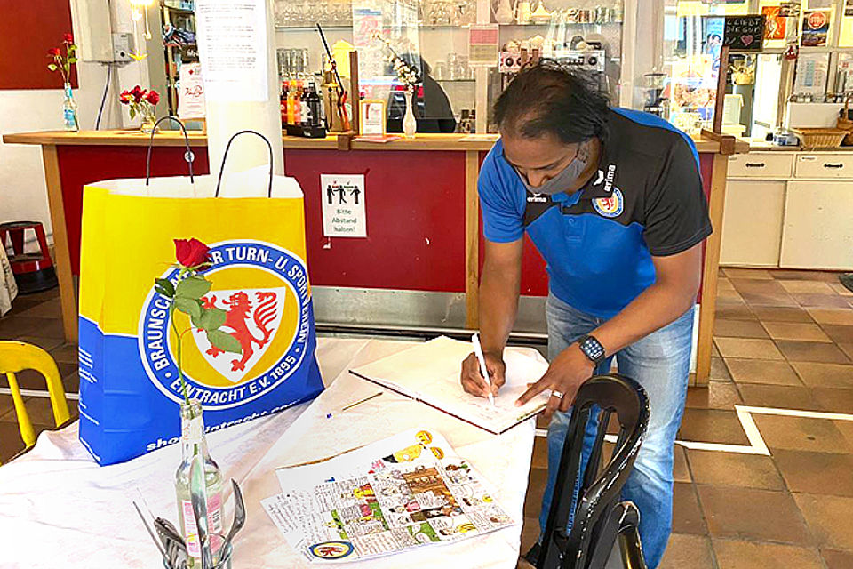 Das war eine tolle Überraschung zunächst für die Mitarbeiter*innen des DRK-Seniorenheims Steinbrecherstraße, der DRK-KaufBar, in der Schuldnerberatungsstelle, der Beratungsstelle BETA, der Rettungswache am Hauptgüterbahnhof, drei Kitas und der DRK-Begegnungsstätte/Nachbarschaftshilfe „Am Wasserturm“: Für den Verein Eintracht Braunschweig und dessen Stiftung überreichte Kosta Rodrigues, Sportlicher Leiter der Fußballschule von Eintracht Braunschweig, Tüten mit Schokoladen- und Haribo-Überraschungen, Tee und Kaffee sowie Zeichnungen von Kindern der Eintracht-Mitarbeiter. In der KaufBar-Tüte lag sogar ein ganzer selbst gemalter Comic der bunten Tüte bei.