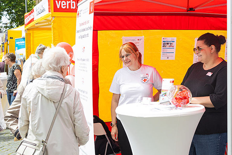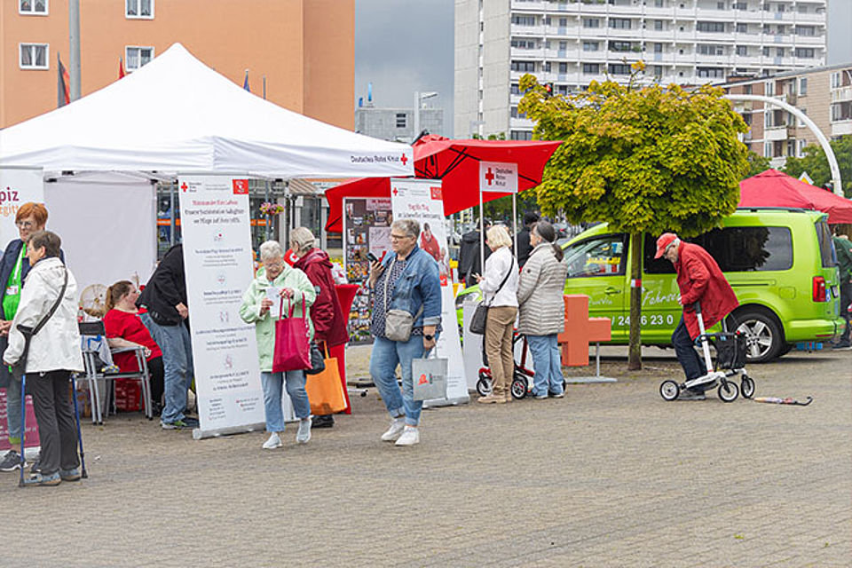 Bei strahlendem Sonnenschein konnten sich die zahlreichen Besucherinnen und Besucher an rund 60 Infoständen über vielfältige Angebote und Dienstleistungen informieren. An unserem DRK-Stand standen Mitarbeitende aus der Sozialstation „Am Queckenberg“, der Wohnberatung, der Nachbarschaftshilfe und der Begegnungsstätte „Am Wasserturm“ bereit, um Fragen zu beantworten und wertvolle Anregungen zu geben.