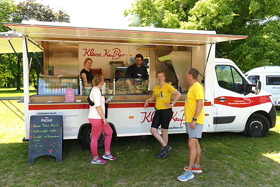 Food-Truck „Kleine KaufBar“ vertreten – und versorgte Sportler und Besucher des begleitenden Bühnenprogramms im Bürgerpark mit leckeren Speisen. In dem Park wurden die insgesamt drei Läufe über vier beziehungsweise acht Kilometer gestartet, auch der Zielbereich war dort. 350 Läuferinnen und Läufer beteiligten sich in diesem Jahr am Friedenslauf, Schirmherr war Oberbürgermeister Dr. Thorsten Kornblum.