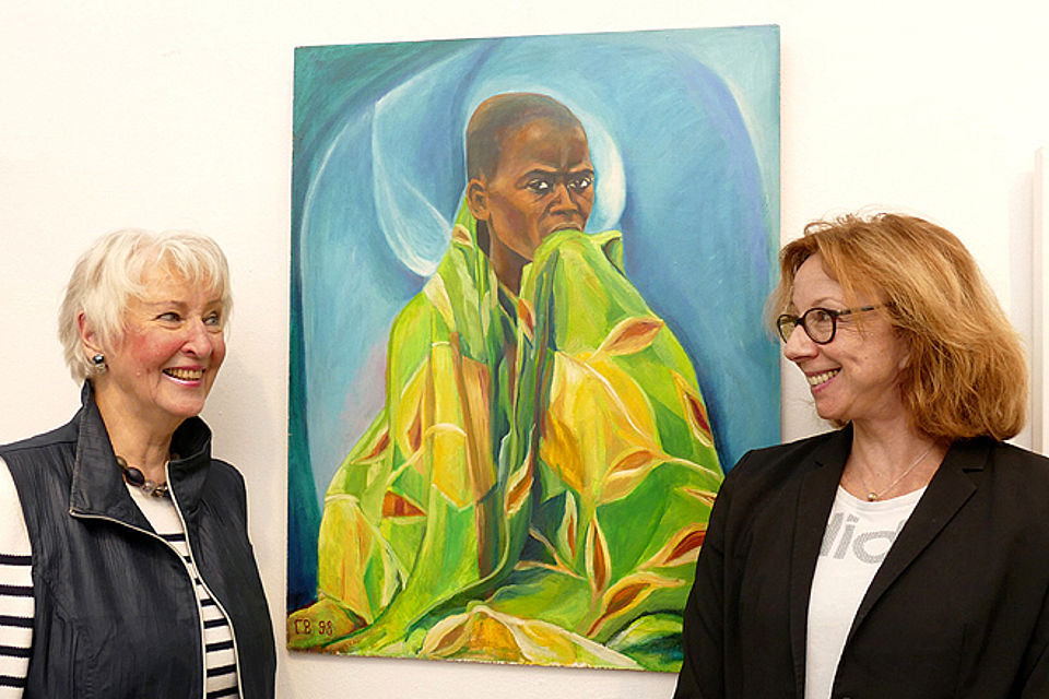 Heike Blümel zeigte sich beeindruckt von der Aussagekraft des Bildes, das eine zur Flucht gezwungene junge Afrikanerin darstellt. Das Kunstwerk entstand 1998, Rotkreuz-Fördermitglied Christiane Brennecke nahm seinerzeit ein Foto aus einer DRK-Borschüre als Grundlage für ihr Gemälde. „Bei der Darstellung von Menschen achte ich sehr auf den Ausdruck. Dieser jungen Frau steht förmlich ins Gesicht geschrieben, dass sie Schlimmes erlebt hat und in eine ungewisse Zukunft schaut“, erklärte die Künstlerin.