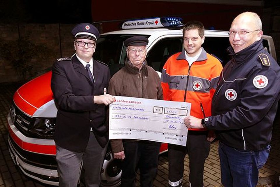 Das Foto zeigt die Übergabe eines Schecks in Höhe von 1110 Euro durch das ehemalige DRK-Präsidiumsmitglied Dr. Ulrich Barkow (Zweiter von links) an die Bereitschaft. Anlässlich seines 80. Geburtstags hatte Barkow statt Geschenken um Spenden gebeten. Mit dem Geld werden die Beklebung des Fahrzeugs und ein Teil der Blaulichtanlage finanziert.