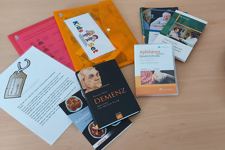 Zusätzlich beinhaltet der Demenzkoffer mehrere Bücher und Broschüren: „Abschied von meinem Vater“, „Richtig sprechen mit dementen Menschen“, „Brücken in die Welt der Demenz“, „Die Alzheimer-Krankheit und andere Demenzen“ sowie „Alzheimer und Demenz“. Zum Inhalt gehört ebenfalls die DVD „Apfelsinen in Omas Kleiderschrank“ mit drei Filmen zum Thema. Der namensgebende Film gibt etwa am Beispiel des 16-jährigen Daniel und seiner erkrankten Großmutter Anna Einblicke in das familiäre Zusammenleben mit einem demenziell erkrankten Menschen.
