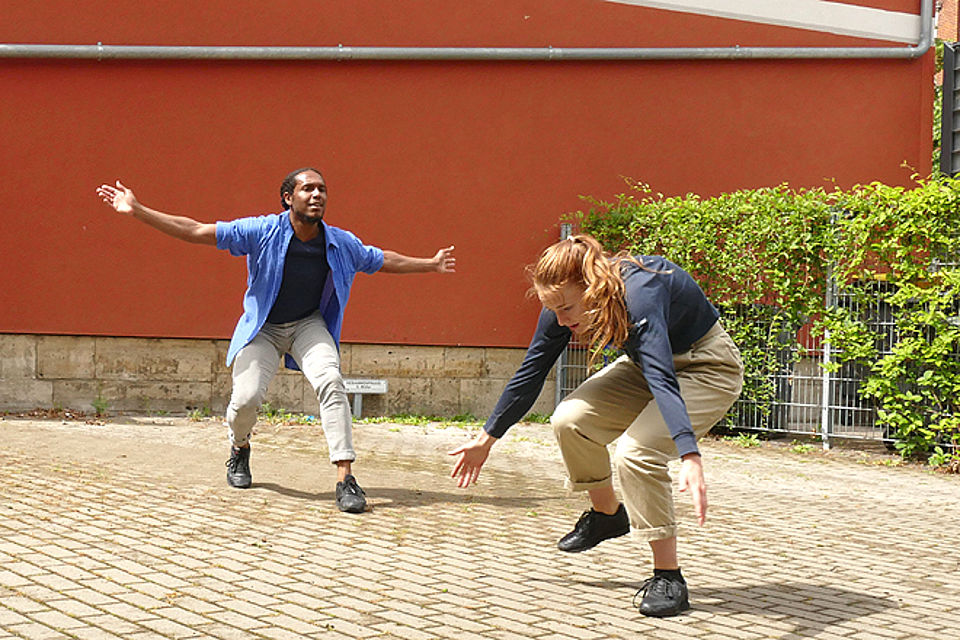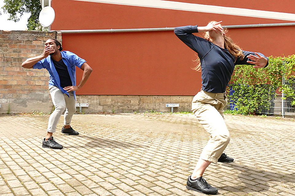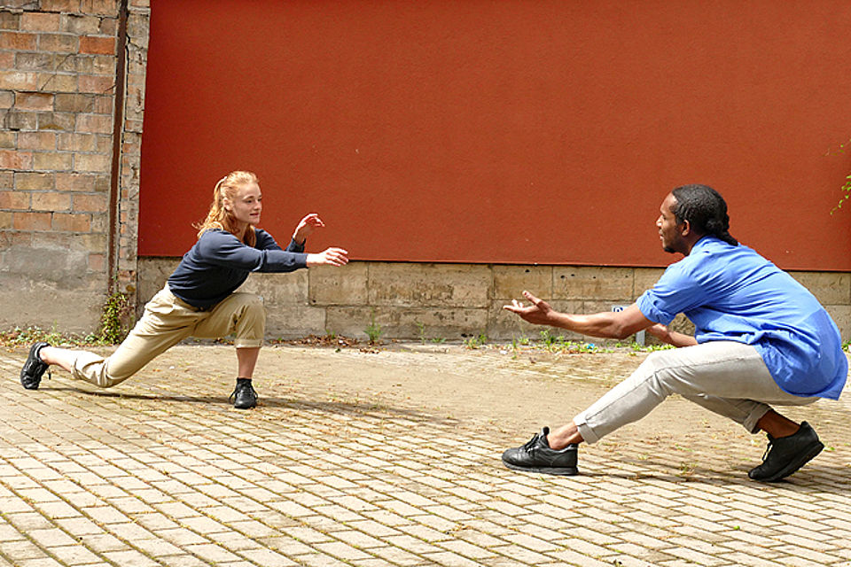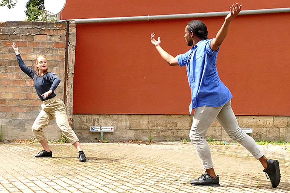 Steffi de Leeuw aus den Niederlanden und Adrian Wanliss aus Jamaica zeigten eine freie Tanz-Interpretation, in deren Verlauf sich zwei Menschen begegnen, sich – mit Abstand – näher kommen, bevor dann wieder jeder seinen eigenen Weg nimmt. „Fast ein bisschen wie bei Corona“, meinte Tänzer Adrian Wanliss. Begleitet wurden die beiden von Trainerin und Tanztheater-Disponentin Susan McDonald.