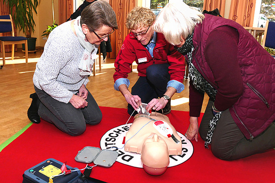 Die Teilnehmer erhalten einen Überblick über erste notwendige Schritte bei Notfällen und über Herz-Kreislauf-Erkrankungen. Geübt werden stabile Seitenlage und erste Maßnahmen bei Kreislaufstillstand wie Herzdruckmassage mit Beatmung. Außerdem erfahren die Senioren, wie ein Defibrillator funktioniert und dass die Rettungsleitstelle bei Bedarf am Telefon bleibt, bis der Rettungswagen eintrifft. „Wir haben ein bisschen die Angst verloren, weil wir gemerkt haben, dass die Maßnahmen nicht wirklich schwer sind“, berichteten Teilnehmer des ersten Kurses speziell für Senioren.