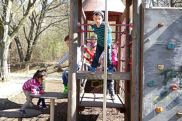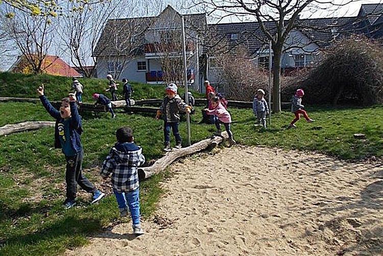 Unser naturbelassenes Außengelände mit Rutsche, Schaukel, Balancierbalken, Sandspielflächen, Rasenflächen, Hecken und Weidentipis von ca. 3470 Quadratmetern bietet den Kindern viel Platz zum Klettern, Rutschen, Schaukeln, Experimentieren und Verstecken. Der angrenzende öffentliche Spielplatz mit attraktiven Spielgeräten ist durch einen direkten Zugang bei Bedarf schnell zu erreichen.