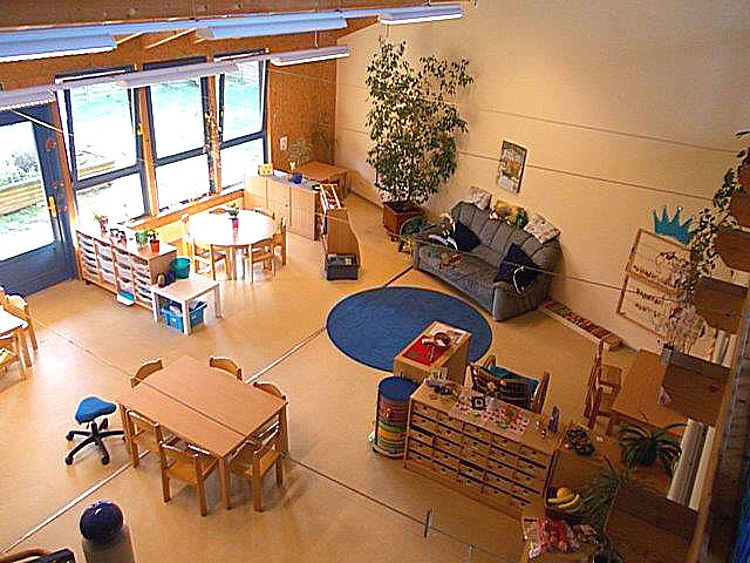 Das Gebäude ist zweigeschossig und bietet im Obergeschoss offene Emporen, in denen für die Kinder Bauecken, Puppenecken sowie Verkleidungsecken eingerichtet sind. Im Erdgeschoß wurden große Fensterflächen sowie Außentüren vor den Gruppenräumen, im Spielflur und im Begegnungsraum konzipiert. Die hellen und mit warmen Farben gestalteten Gruppenräume bieten den Kindern beste Entfaltungsmöglichkeiten.