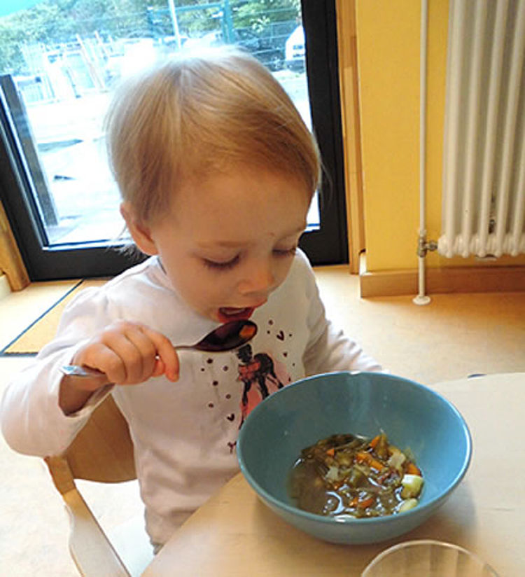 Jeden Morgen starten wir gemeinsam mit einem Frühstück, das die Kinder von zu Hause mitbringen. Die Eltern sorgen für eine gesunde und ausgewogene Zusammenstellung dieser Mahlzeit. Das Mittagessen bereiten wir täglich frisch in unserer eigenen Küche zu, wobei wir die „DGE-Qualitätsstandards für die Verpflegung in Tageseinrichtungen für Kinder“ einhalten. Unser Speiseplan basiert auf einer ausgewogenen und nährstoffoptimierten Kost, die vorrangig pflanzliche Zutaten nutzt und den Einsatz von tierischen sowie fett- und zuckerreichen Lebensmitteln minimiert.