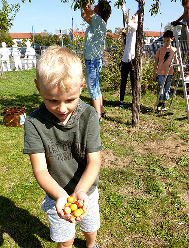 Wer einen großen Garten hat, muss die Pflanzen auch hegen und pflegen und gießen. So auch im Jugendzentrum, das nach dem Neubau einen richtig schönen Garten zum Spielen, aber auch zum Pflanzen und Ernten hat. Obstbäume – Äpfel, Birnen, Pflaumen und Renekloden, das sind kleine, goldfarbene Edel-Pflaumen – wachsen dort, zum ersten Mal nach viereinhalb Jahren haben diesmal die Renekloden-Bäume reichlich Früchte hervorgebracht. Bestes Nasch-Obst für zwischendurch und für leckere Kuchen. Äpfel hingen nach guter Vorjahresernte diesmal nicht an den Bäumen, Pflaumen drei, und die Birnenbäume lassen noch immer auf Ertrag warten.