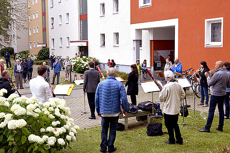 Diese Klänge im Südhof des Quartiers Ilmweg in der Braunschweiger Weststadt, an dem wenige Meter weiter auch das DRK-Familienzentrum Ilmweg mit Krippe seinen Sitz hat, waren etwas Besonderes: Vier Arien aus „Die Hochzeit des Figaro“ und „Don Giovanni“, beides bekannte Opern von Wolfgang Amadeus Mozart, wurden live gespielt und gesungen von acht Musikern und vier Sängerinnen und Sänger des Staatstheaters Braunschweig. Gesungen wurde von Rainer Mesecke (Bass), Jelena Banković (Sopran), Maximilian Krummen (Bariton) und Valentin Anikin (Bass). Eingesetzt wurden die Instrumente Oboe, Horn und…