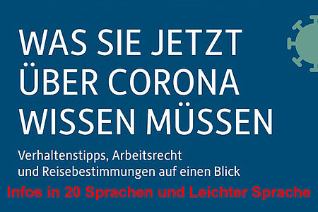 Wenn Sie Menschen mit ausländischen Wurzeln kennen, die der deutschen Sprache nicht so mächtig sind, aber sich auch dringend über das Coronavirus und die aktuellen Verordnungen der Bundesregierung informieren wollen, haben wir den passenden Link mit Informationen in 20 Sprachen. Selbstverständlich finden Sie dort alle Informationen auch in deutscher Sprache.