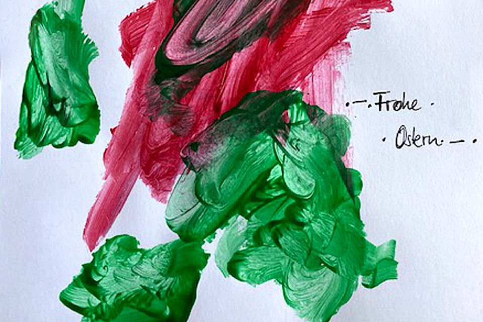 Die Mutter von Jezal schreibt auf einer Grußkarte, auf deren Vorderseite das Bild gemalt wurde: „Liebe Bewohner des DRK-Seniorenheims! Wir wünschen Ihnen in diesen schweren Tagen, in denen Sie auf so wichtigen Besuch verzichten müssen, viel Kraft und Durchhaltevermögen. Wir hoffen, sie können trotz allem ein schönes Osterfest verbringen. Vielleicht trägt diese Karte ja etwas dazu bei. Mein Sohn Jezal hat Ihnen etwas gemalt – irgendetwas mit Ostern und Dinosauriern, sagt er. Alles Gute!“