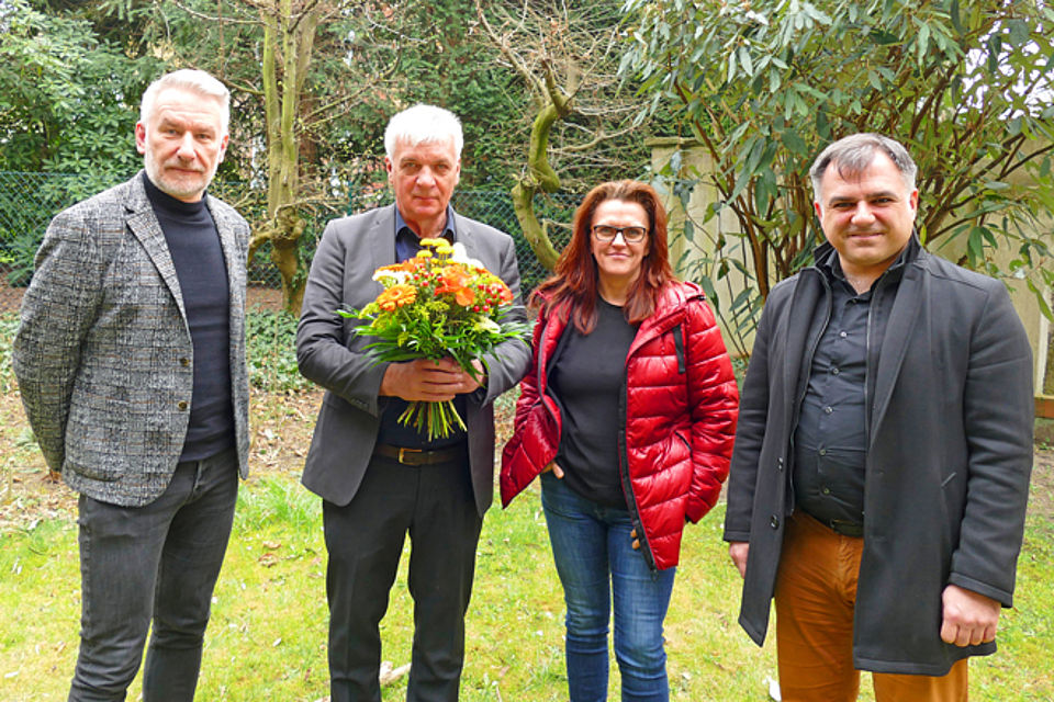 Christian Blümel (Zweiter von links), langjähriger Vorstandsvorsitzender des DRK-Kreisverbands Braunschweig-Salzgitter, wurde jetzt in den Ruhestand verabschiedet. Alleinige Vorständin ist bereits seit Anfang Januar Nicole Kumpis (Zweite von rechts), links der kaufmännische Leiter Andreas Burow. Verabschiedet wurde Christian Blümel unter anderem vom Präsidenten des DRK-Kreisverbands, MdB Dr. Christos Pantazis (rechts).