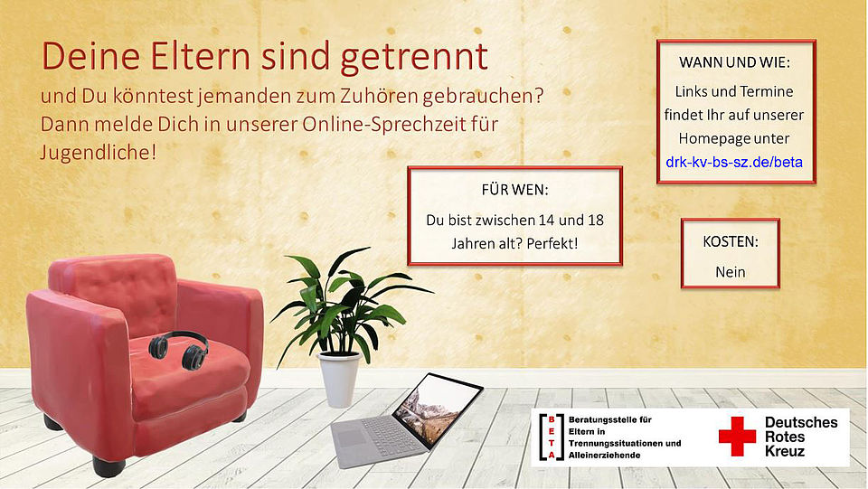 So hat sich die Beratungsstelle BETA in Trägerschaft des Deutschen Roten Kreuzes (DRK) in Braunschweig entschieden, ihr Spektrum schon jetzt, weit vor den Erkenntnissen aus der neuen Studie, entsprechend zu erweitern – und wendet sich direkt an die 14- bis 18-Jährigen. Vom 4. Februar an gibt es alle 14 Tage jeweils freitags zwischen 15.30 und 17.30 Uhr kostenlose Online-Sprechzeiten, die die Jugendlichen per Video oder Telefon ohne Voranmeldung nutzen können. „Ich habe ein offenes Ohr für eure Probleme und Fragen“, erläutert die Beraterin, „dabei ist es egal, ob sich eure Eltern schon getrennt haben, sich gerade trennen oder ihr nur das Gefühl habt, dass eine Trennung vielleicht passieren könnte.“