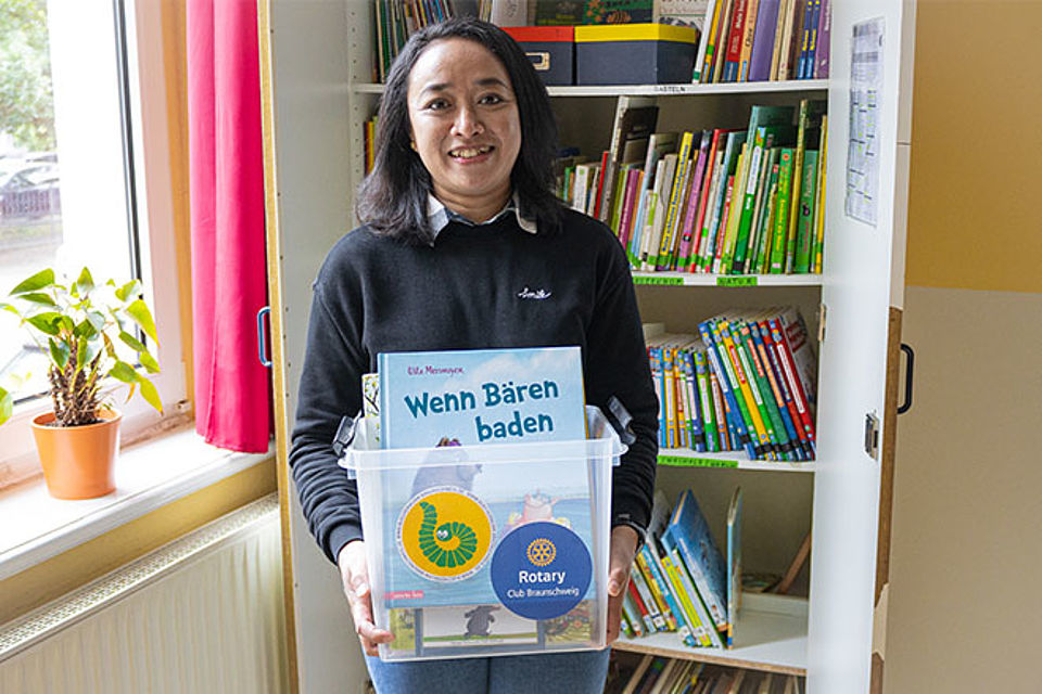 Auch unser DRK-Familienzentrum an der Broitzemer Straße in Braunschweig konnte sich über eine dieser Bücherkisten freuen. Dian Liyah, Mitarbeiterin in unserem DRK-Familienzentrum und zuständig für unsere Bücherei, war besonders glücklich über die neuen Bücher. Im Laufe der Jahre hat sich ein umfangreicher Bestand an Kinderbüchern angesammelt, jedoch sind einige davon nicht mehr zeitgemäß und andere haben ihre besten Tage bereits hinter sich. Nochmals herzlichen Dank an den Rotary Club Braunschweig für diese großzügige Spende!