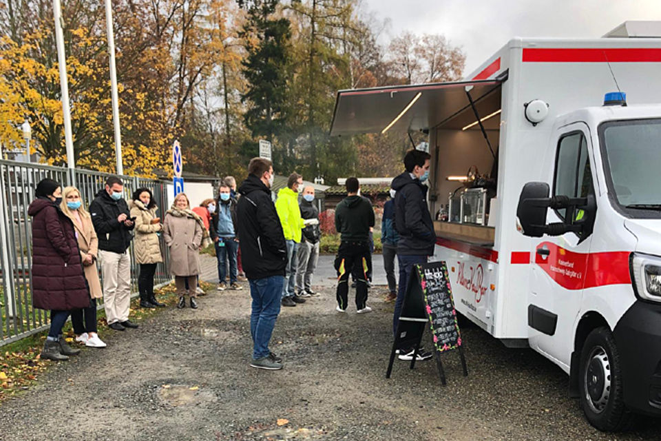 Der DRK-Food-Truck benötigt mit Platz zum Verkauf eine Stell- und Betriebsfläche von rund 10 x 20 Metern. Wenn zwei Stromzuleitungen (230 V, 16 A) zur Verfügung stehen, kann der Imbisswagen autark arbeiten.