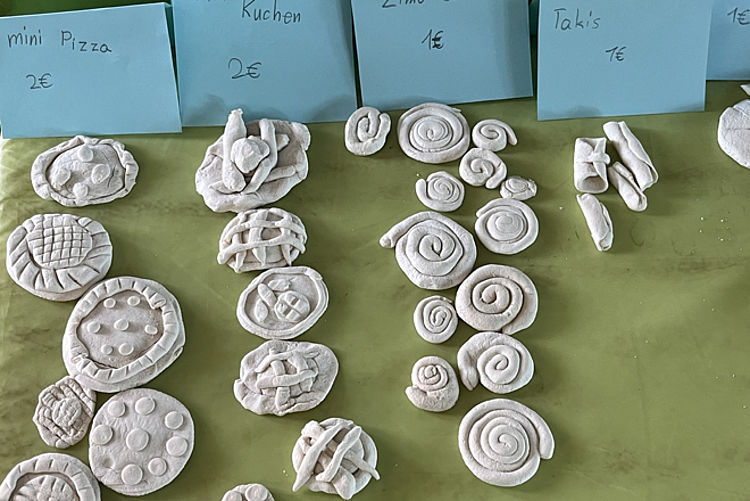 Alle Kinder waren mit großem Eifer bei der Sache und kneteten den Teig als wären sie alle professionelle  Brotbäcker und Konditoren. Als die Teiglinge dann fertig gebacken waren, leider jedoch auch zum Verzehr ungeeignet, aber immer wieder einsetzbar, konnte der Verkauf mit Spielgebackenem im fairen Tausch gegen Spielgeld losgehen. Es wurden Auslagen dekoriert und Preisschilder bemalt. Die Wirtschaft wurde angekurbelt, als wäre von Inflation, Rezession und Konsumverdrossenheit nichts zu spüren. Auch von Fachkräftemangel keine Spur – alle wollten BäckereifachverkäuferInnen sein.