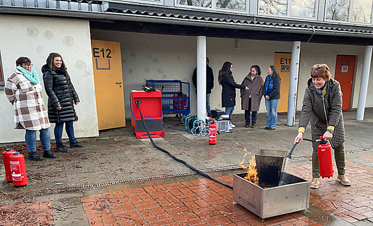 Das neue Jahr startete am ersten Freitag in der Schülerganztagsbetreuung/GTB in Wenden mit einer Brandschutzübung aller MitarbeiterInnen inklusive praktischem Teil, in diesem Fall einer Übung mit Feuerlöschern auf dem Schulhof und mit „echtem“ Feuer. So wurde der „trockene“, aber natürlich ebenso wichtige Theorieteil gut ergänzt und aufgelockert. Alle Mitarbeitenden waren mit Interesse dabei, sie waren sozusagen „Feuer und Flamme“.