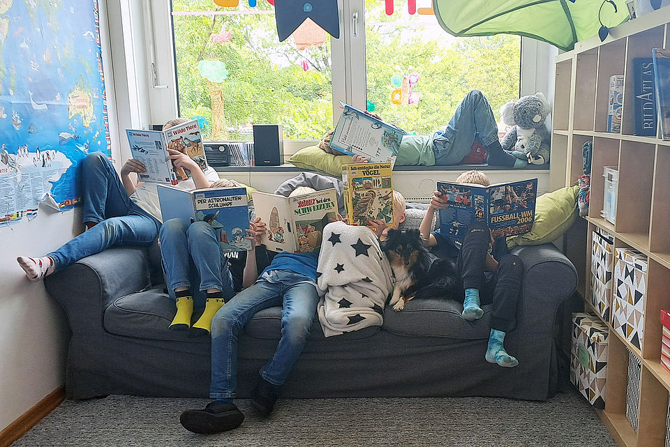 Aber der Besuch ist mehr als nur Ausleihe! In der gemütlichen Spiel- und Leseecke der Bücherei spielen, lesen und „schmökern“ die Kinder mit viel Freude. Mit ihren neu entdeckten Schätzen genießen sie anschließend ein „gemütliches Lesepäuschen“ auf dem Sofa in ihrer Gruppe und tauchen in die spannende Welt der Bücher ein.