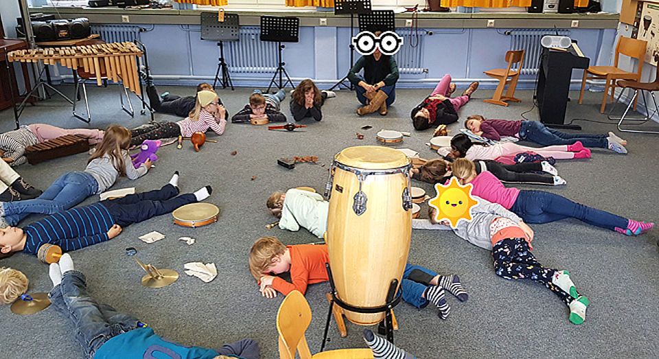 Entspannung im Musikraum der Schule, ehe der Herbst klanglich umgesetzt wird.