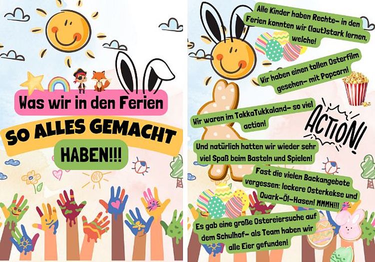 Ein echtes Highlight war der Ausflug ins TakkaTukkaLand – dort wartete jede Menge Action auf uns! Natürlich durfte auch ein gemütlicher Filmnachmittag mit Popcorn nicht fehlen. Und bei der großen Ostereiersuche auf dem Schulhof waren Teamgeist und Spürsinn gefragt – gemeinsam haben wir alle Eier gefunden! Ein besonders wichtiger Programmpunkt war in diesem Jahr das Thema Kinderrechte: In verschiedenen Aktionen und auf kreative Weise lernten die Kinder, lautstark und mit Begeisterung, was ihnen zusteht – und dass ihre Stimme zählt. So wurde aus Spiel und Spaß auch eine starke Botschaft.