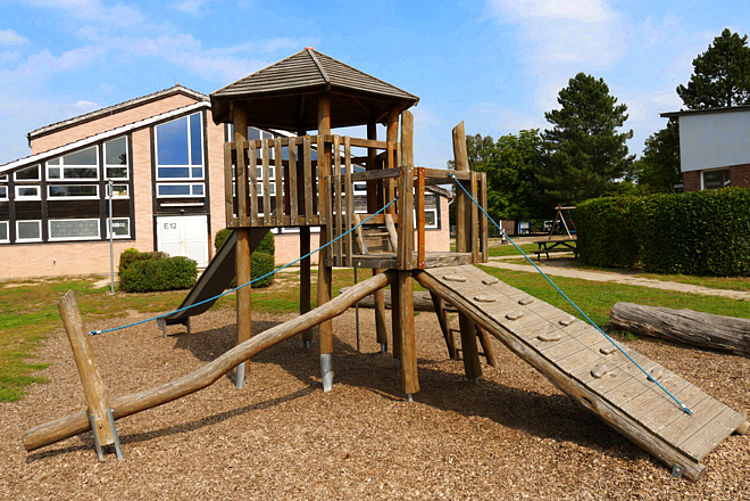 Klettergerüst auf dem Schulhof und Turnhalle im Hintergrund.